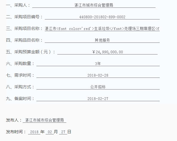 内容摘要:湛江市生活垃圾处理场三期填埋区生活垃圾开挖与转动项目采购计划公告