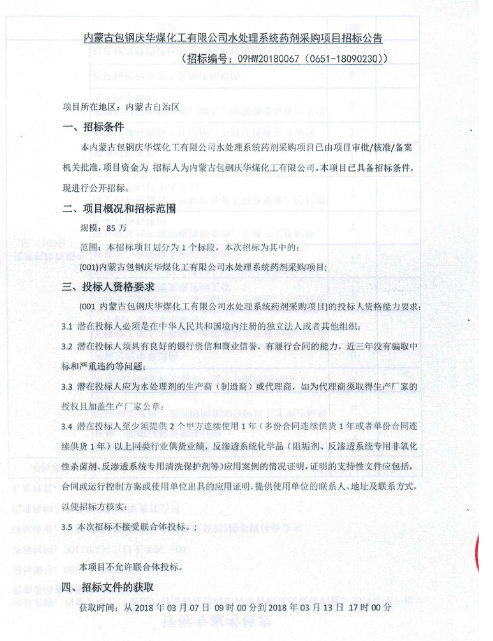 内蒙古包钢庆华煤化工有限公司水处理系统药剂采购项目招标公告