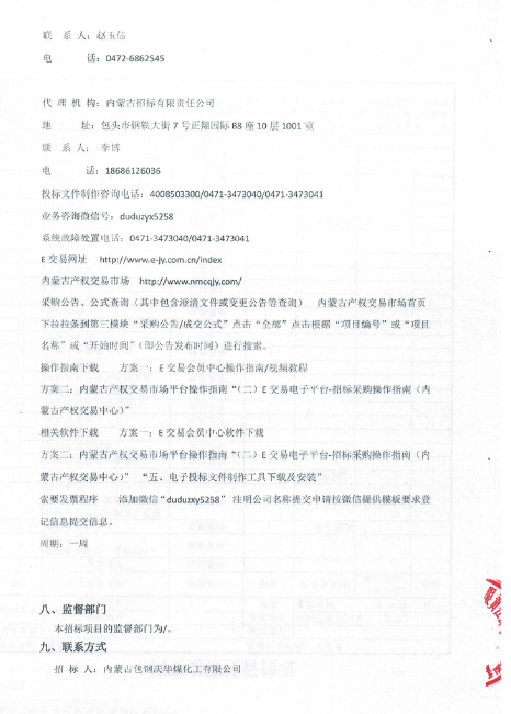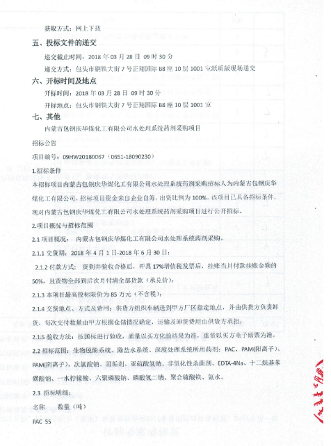 内容摘要:内蒙古包钢庆华煤化工有限公司水处理系统药剂采购项目招标公告