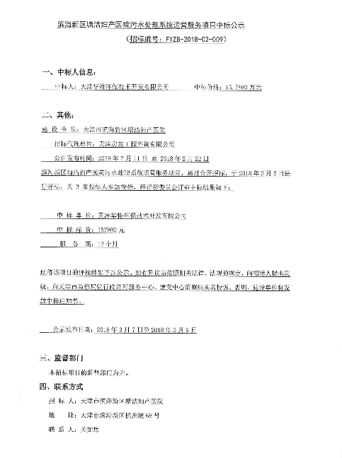滨海新区塘沽妇产医院污水处理系统运营服务项目中标公示