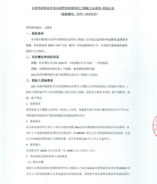 合肥市肥西县生活垃圾焚烧发电项目工程施工总承包招标公告