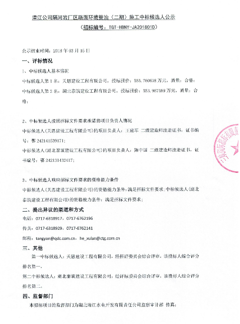 湖北省宜昌市清江公司隔河岩厂区路面环境整治(二期)施工中标候选人公示