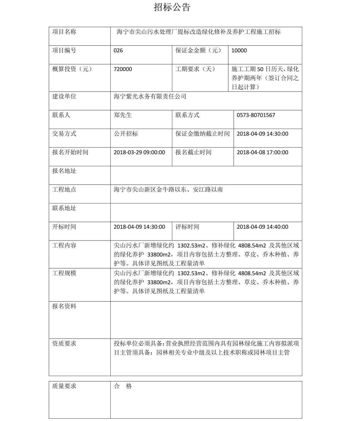 内容摘要:海宁市尖山污水处理厂提标改造绿化修补及养护工程施工招标招标公告