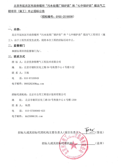 北京市北京市延庆区市政供暖所污水处理厂锅炉房和七中锅炉房煤改气工程项目(施工)中止招标公告