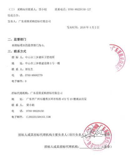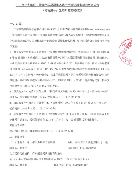 广东省中山市三乡镇环卫管理所垃圾场集水池污水清运服务项目更正公告