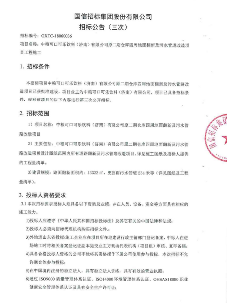 山东省中粮可口可乐饮料(济南)有限公司原二期仓库四周地面翻新及污水管道改造项目工程施工(三次)招标公告
